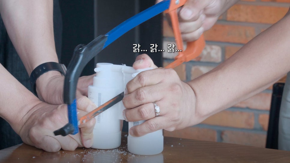 궁금증 해결을 위해 헐크 수질전문가님께서 톱으로 필터를 분해하는 모습을 보고계십니다.